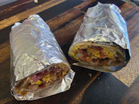 All American Foods! We cook breakfast burritos and sandwiches to order all day long.